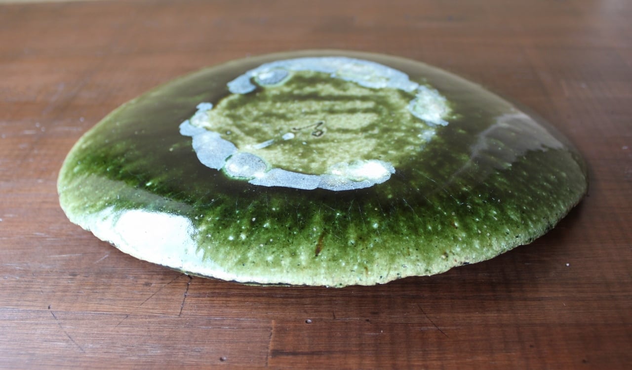 たたら作りです。皿の角は指で上げています。右上と左下に線の模様を施して、アクセントとなっています。織部の緑釉はガラス状になっていて、よく見るとヒビのような貫入が入っています。